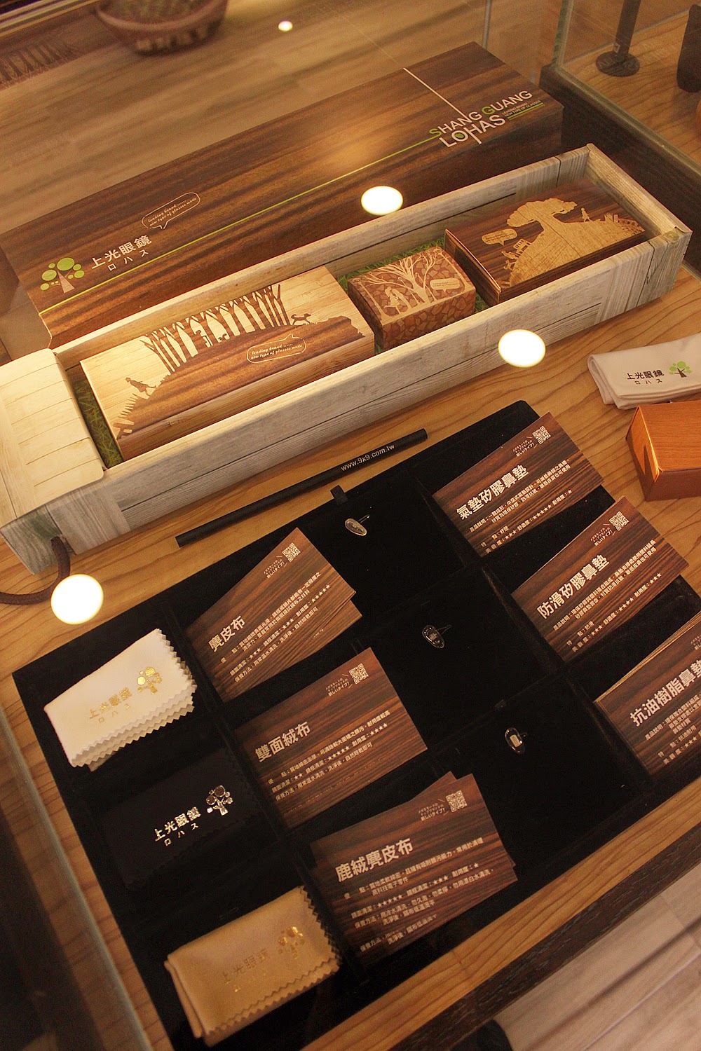 喔對了,看到拉出來的抽屜才想到服務人員在介紹眼鏡的時候,是把擺飾櫃下方的抽屜拉出來,直接一層一層讓我挑想要的眼鏡。